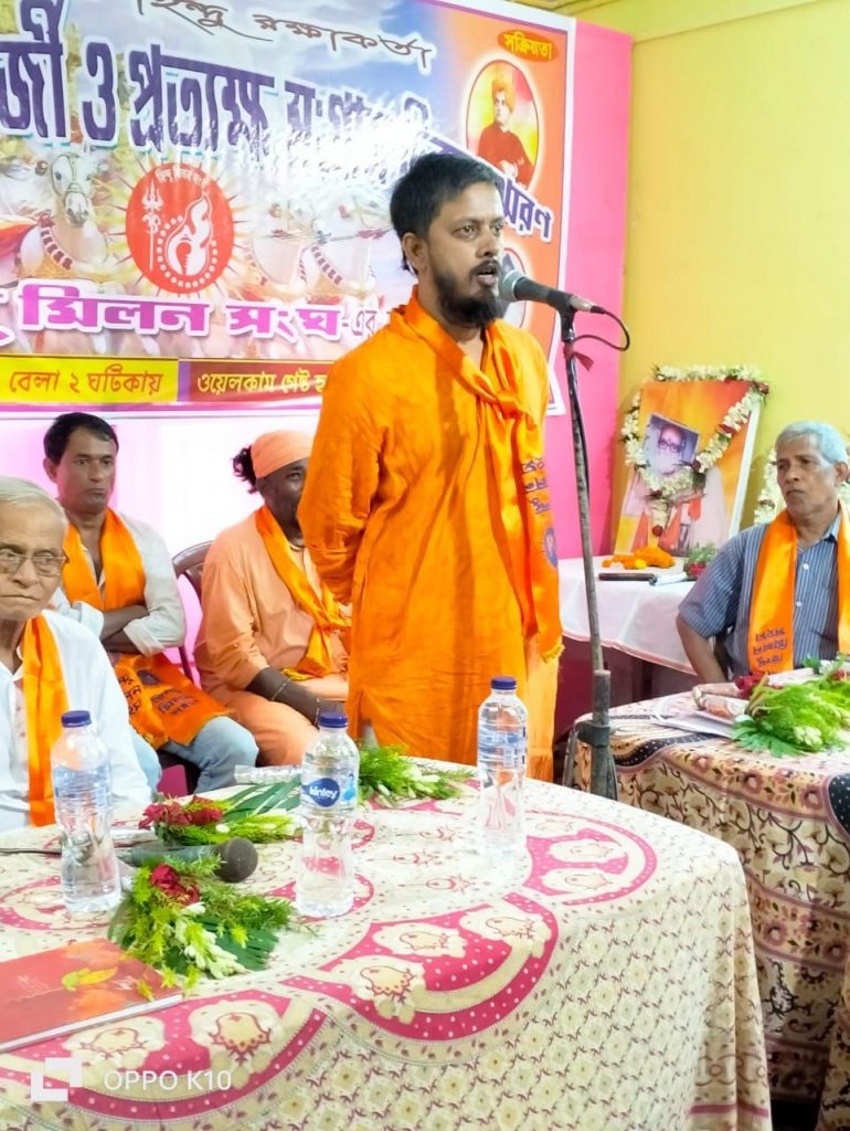 পরম পূজ্য মাননীয় তপন ঘোষ মহাশয় আদর্শে আদর্শিত হিন্দু মিলন সংঘের সভাপতি রাজকুমার সরদার মহাশয়ের জ্বালাময়ী ভাষণ সভাস্থলকে মুখরিত করে তুলেছিল হাততালি,জয় মা কালী, হর হর মহাদেব, ভারতমাতা কি জয় এবং জয় শ্রীরাম স্লোগানে।