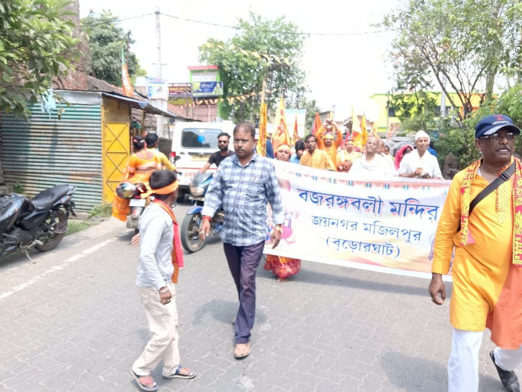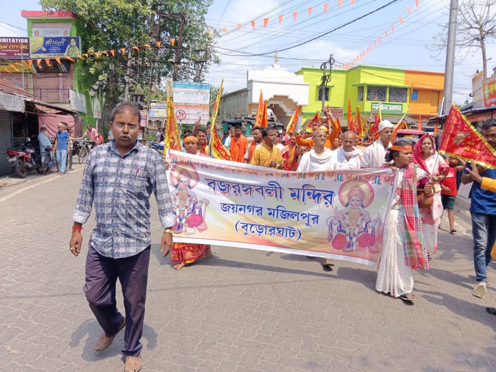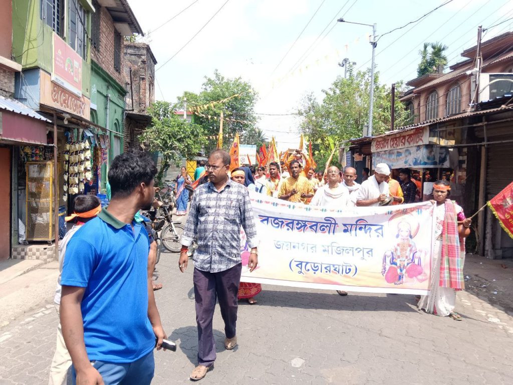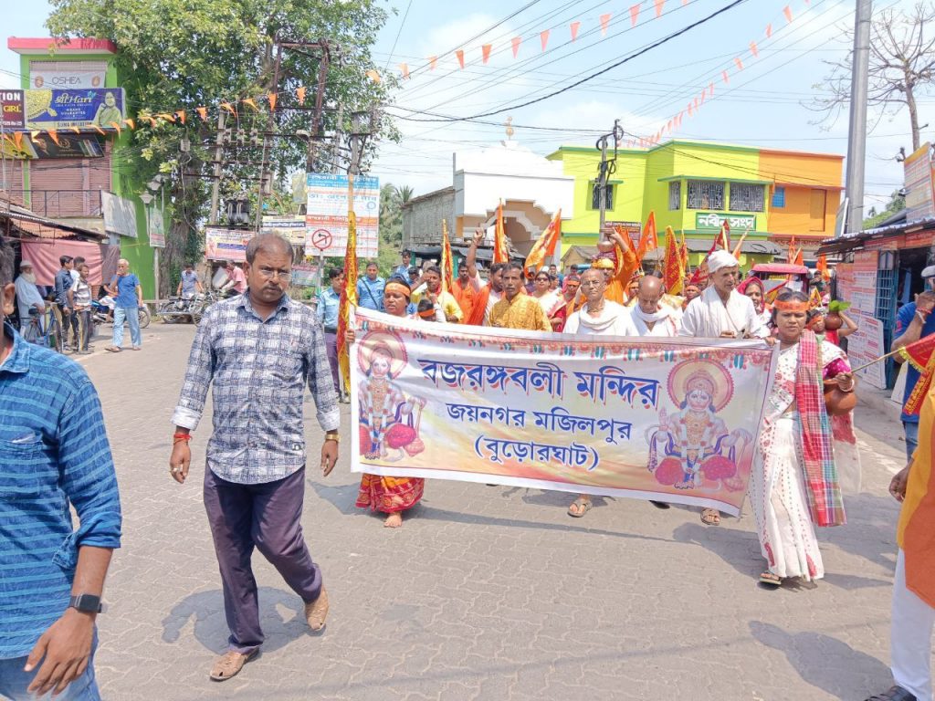 ১২ই এপ্রিল ২০২৫ সঙ্কটমোচন মহাবীর শ্রী শ্রী হনুমান জয়ন্তী উপলক্ষে দক্ষিণ ২৪ পরগনার জয়নগর থানার অন্তর্গত বুড়োর ঘাটে সঙ্কটমোচন মহাবীর বজরংবলীর মন্দিরে পূজোর আয়োজন। আজ সকালে ১০৮ কলস গঙ্গাবারি সহযোগে শোভাযাত্রা সহযোগে বজরংবলির মন্দিরে বজরঙ্গবলীর বিগ্রহকে স্নান করানো হয়। এই অনুষ্ঠানে হিন্দু মিলন সংঘের কর্মীরা আমন্ত্রিত ছিলেন। হিন্দু মিলন সংঘের সভাপতি শ্রী রাজকুমার সরদার মহাশয় শোভাযাত্রায় অংশগ্রহণ করেন ও নেতৃত্ব দেন।