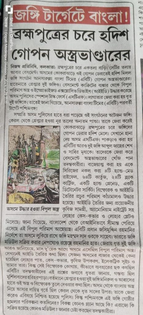 সম্প্রতি অসম পুলিসের হাতে ধরা পড়েছে ওই সংগঠনের আটজন জঙ্গি। কেরল থেকে গ্রেপ্তার হওয়া নূর তাদের অন্যতম পাণ্ডা। তাকে জেরা করেই কোকরাঝাড়ে ব্রহ্মপুত্রের চরে জঙ্গিদের গোপন ডেরার হদিশ মেলে। সেখানে হানা দেয় অসম এসটিএফ। পাকড়াও করা হয় এবিটির আরও দুই জঙ্গি আব্দুল জাহের শেখ ও সাব্বির মৃধাকে। তাদেরকে জেরা করে বেসমেন্টে অস্ত্রভাণ্ডারের খোঁজ পান তদন্তকারীরা। বাজেয়াপ্ত করা হয় একে সিরিজের নকল করা ৪টি হ্যান্ড-মেড রাইফেল, ৬৪টি কার্তুজ, ২৪টি ব্ল্যাক কার্ট্রিজ, একটি হ্যান্ড গ্রেনেড, একটি ডিটোনেটর সার্কিট। বিস্ফোরক ও আইইডি তৈরির প্রচুর পরিমাণ কাঁচামালও উদ্ধার হয়েছে। আইইডি তৈরির জন্য প্রয়োজনীয় কৃষিজ সামগ্রী, অ্যামোনিয়াম নাইট্রেট সহ লোহার কেস-কভার ও লোহার প্লেটও মিলেছে। জানা গিয়েছে, বাংলাদেশ থেকে বেআইনিভাবে সীমান্ত পেরিয়ে এসেছে এই বিপুল পরিমাণ আগ্নেয়াস্ত্র। এবিটি প্রধান জসিমুদ্দিন রহমানির নির্দেশে তা অসমে লুকিয়ে রাখে জঙ্গি মহম্মদ সাদ ওরফে সাহেব। ভারতে জঙ্গি মডিউল সক্রিয় করার নেপথ্যেও রয়েছে রহমানির হাত। জেরায় ধৃত দুই জঙ্গি আরও জানিয়েছে, মাস দু’য়েক আগে অসমে এসেছিল বিপুল পরিমাণ অস্ত্র। সেখানেই আইডি তৈরির কথা ছিল। সেজন্য অসমের বাজার থেকেই কেনা হয়েছিল লোহার পাত, কেস-কভার, কৃষিজ উপকরণ, ইলেকট্রিক সুইচ ও তামার তার। কিন্তু সেই বিস্ফোরক কোথায়, কীভাবে ব্যবহারের ছক কষছিল এবিটি? তদন্তকারীদের এই প্রশ্নের জবাবে ধৃতরা জানায়, গম্ভব্য ছিল মুর্শিদাবাদের হরিহরপাড়া। বর্তমানে গ্রেপ্তার হওয়া দুই জঙ্গি মনিরুল ও আব্বাসের হাতে ওই অস্ত্র ও বিস্ফোরক তুলে দেওয়ার কথা ছিল। অসম থেকে বাংলায় অস্ত্র নিয়ে আসার দায়িত্ব বর্তে ছিল কেরল থেকে ধৃত সাদের উপর। তাকে জেরা করেও এবিষয়ে নিশ্চিত হয়েছে পুলিস। কিন্তু পশ্চিমবঙ্গে এই জঙ্গি গোষ্ঠীর হামলার পরিকল্পনা কতদিনের? বিকল্প কোনও প্ল্যান আছে কি? এরাজ্যে কি সক্রিয় হয়েছে কোনও মডিউল? জানার চেষ্টা করছেন তদন্তকারীরা।