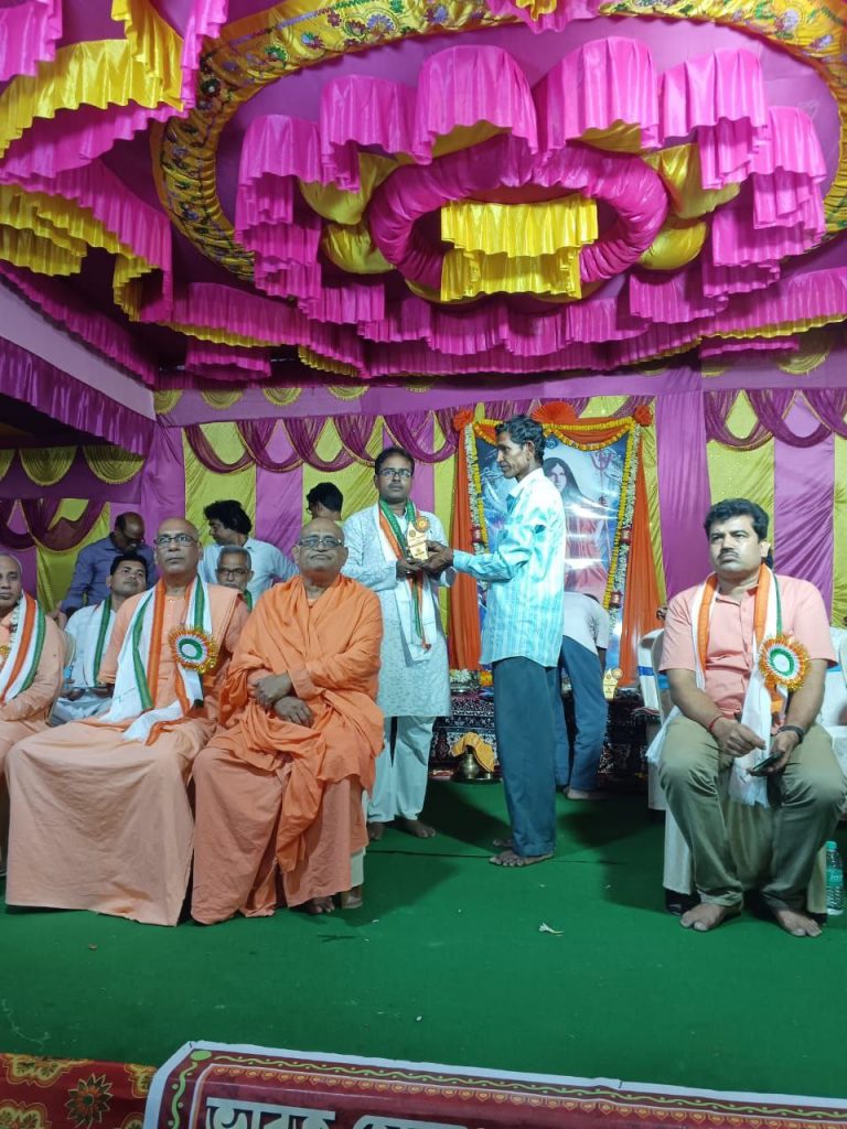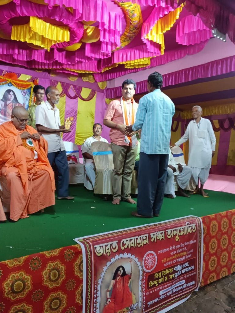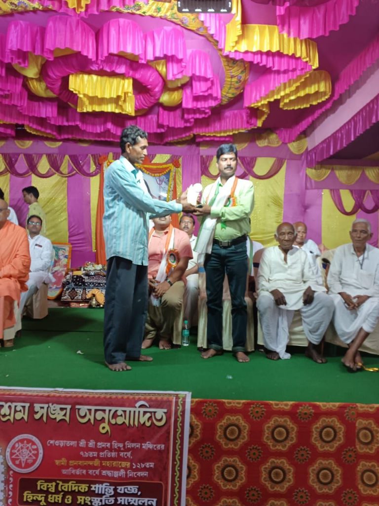 দক্ষিণ ২৪ পরগনা জেলার ঢোলা থানার অন্তর্গত শেওড়াতলা শ্রীশ্রী প্রণব হিন্দু মিলন মন্দিরের ৭৯তম প্রতিষ্ঠা বর্ষ ও শ্রী শ্রী প্রণবানন্দজীর ১২৮তম আবির্ভাব বর্ষ উপলক্ষে বাৎসরিক অনুষ্ঠানে প্রথম দিনের (২২ মার্চ ২০২৩) অনুষ্ঠানে প্রণবজ্যোতি স্মারক সম্মান-২০২৩ সম্মানে হিন্দু মিলন মন্দির সম্মানিত করলেন হিন্দু মিলন সংঘের সভাপতি রাজকুমার সরদার ও উপদেষ্টা আইনজীবী শ্রী তপন কুমার বিশ্বাস মহাশয়কে। সম্মাননা জ্ঞাপনের পর হিন্দু মিলন সংঘের সভাপতি মহাশয় সংক্ষিপ্ত বক্তব্য রাখলেন।
